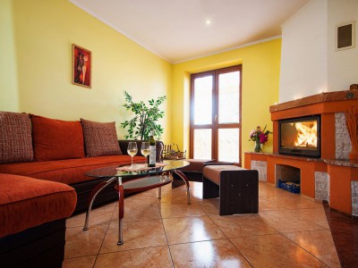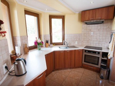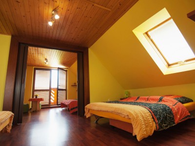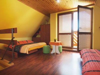 S vlastným vchodom: 2x 4-lôžková izba - izby prepojené, oddelené zhrňovacími dverami, obývačka s krbom, (kúpeľňa so sprchovacím kútom a WC, kuchyňa s TV-SAT, DVD, elektrický sporák, elektrická rúra, chladnička s mrazničkou, rýchlovarná kanvica, mikrovlnná rúra), balkón, spoločná zastrešená terasa s posedením pre 20 osôb s možnosťou grilovania a varenia gulášu v kotline s objemom 15 litrov.
